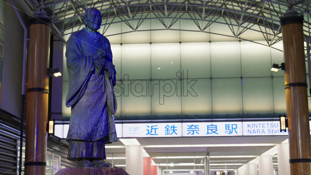 Nara, Japan – April 10, 2025: Gyoki Bodhisattva statue in front of the Kintetsu Nara Station in the evening Royalty Free Stock Video Footage