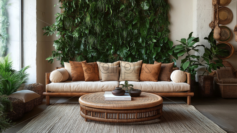nature-inspired living room with vertical plant walls