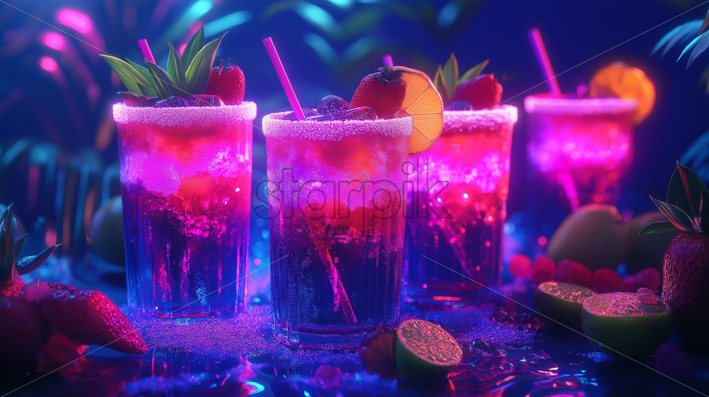 cocktails served in geometric glassware, with dry ice fog neon lights