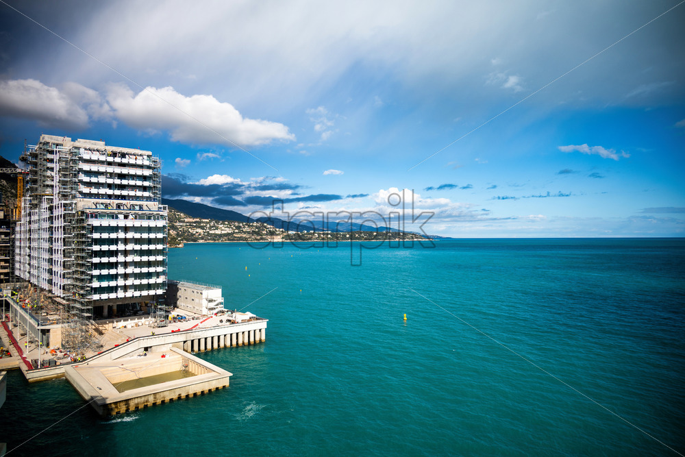 New buildings construction in the sea of Monaco, over blue sea and sky