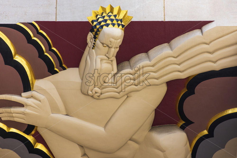 NEW YORK, USA- 20 SEPTEMBER, 2019: facade of the General Electric Building, 30 Rockefeller Plaza. Wisdom and knowledge shall be the stability of thy times, sculpture