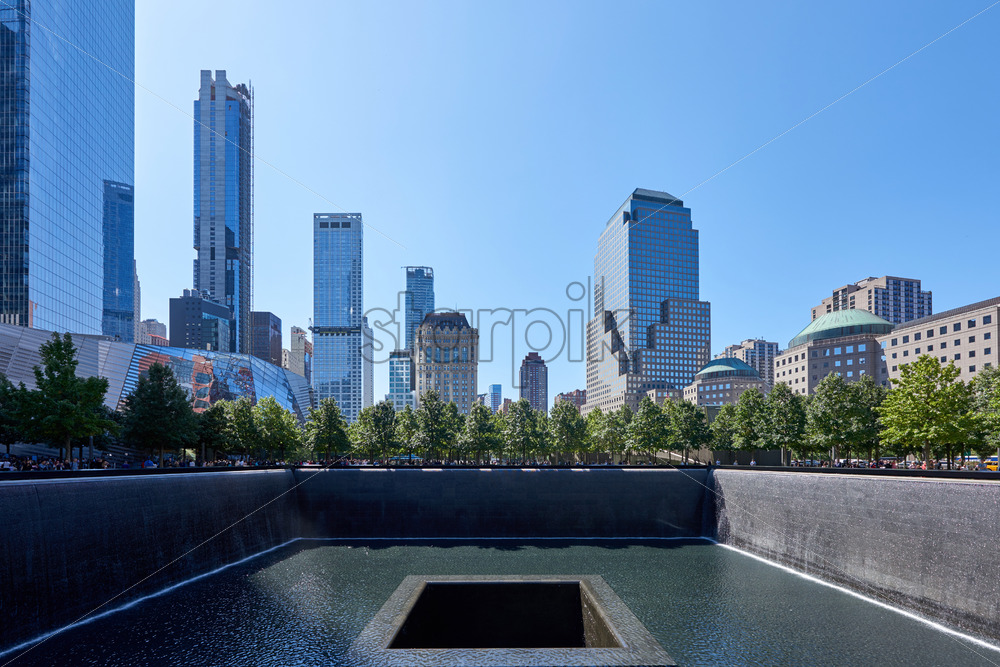 NEW YORK, USA, SEPTEMBER 19: Shot of the World Trade Center Memorial in with lots of walking people