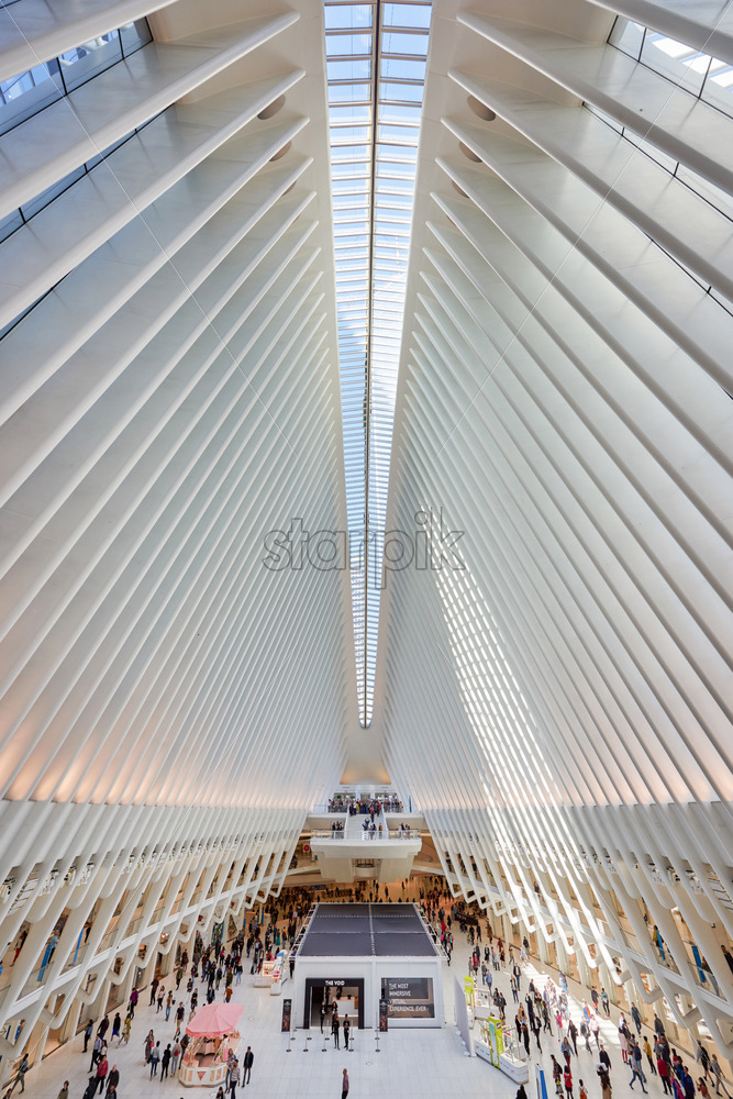 NEW YORK, USA, SEPTEMBER 19: Vertical shot of incredible World Trade Center Station’s interior space with lots of busy and walking people