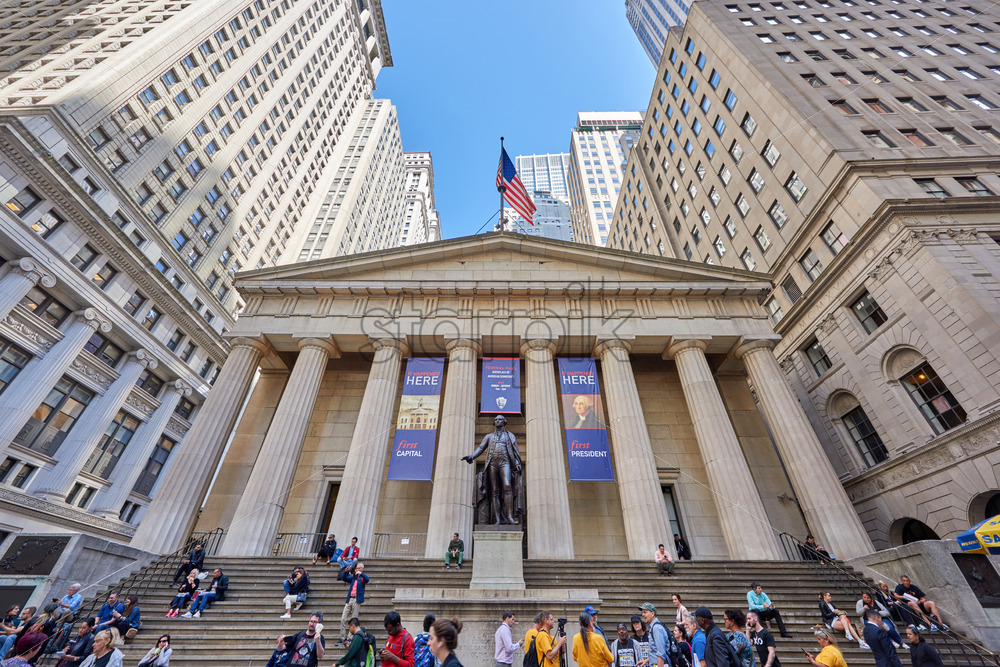 NEW YORK, USA, SEPTEMBER 19: Wide shot of people walking in front of Federal Hall in New York