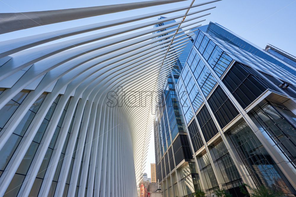 NEW YORK, USA, SEPTEMBER 19: Wide shot of the World Trade Center station in New York with high modern building near it