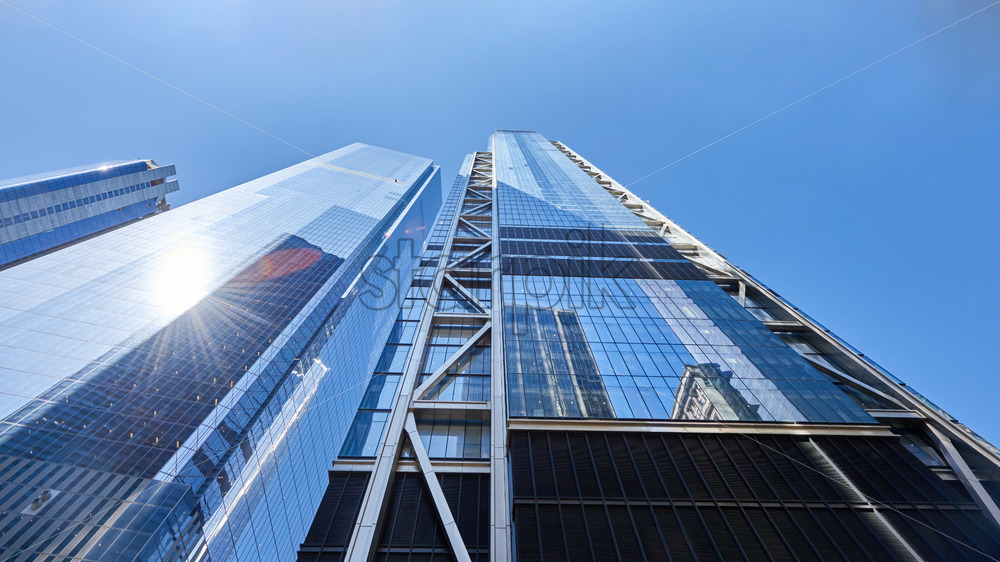 NEW YORK, USA, SEPTEMBER 19: Wide shot of two high and modern buildings with glass facades in New York made from below