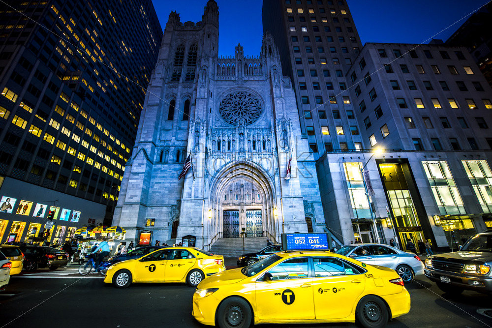 NEW YORK, USA – SEPTEMBER, 2019: Streescape of the city downtown at night. Old church, nightlights, skyscrapers, road with cars
