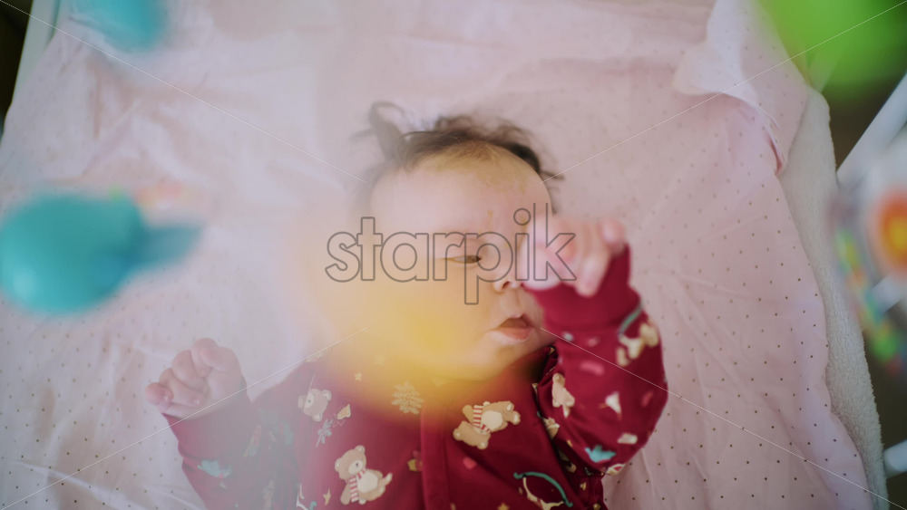 Baby lying on a bed in a pink outfit, looking up at a colourful hanging mobile toy Royalty Free Stock Video Footage