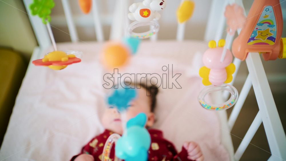 Newborn baby lying in a crib while colorful hanging toys move above
