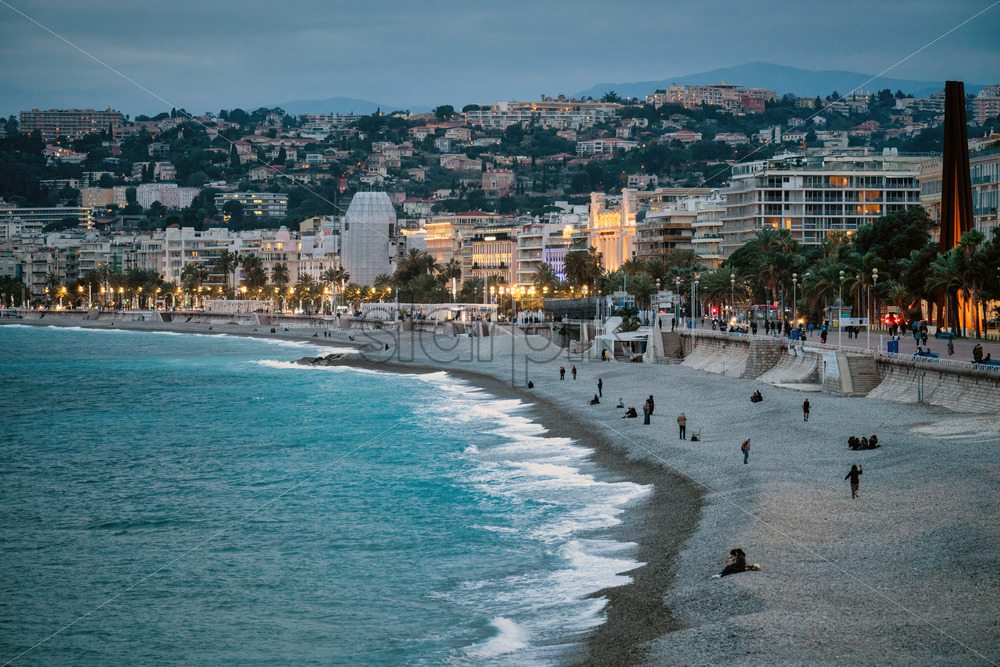 Nice city promenade in the evening at blue hour, buildings with mountains