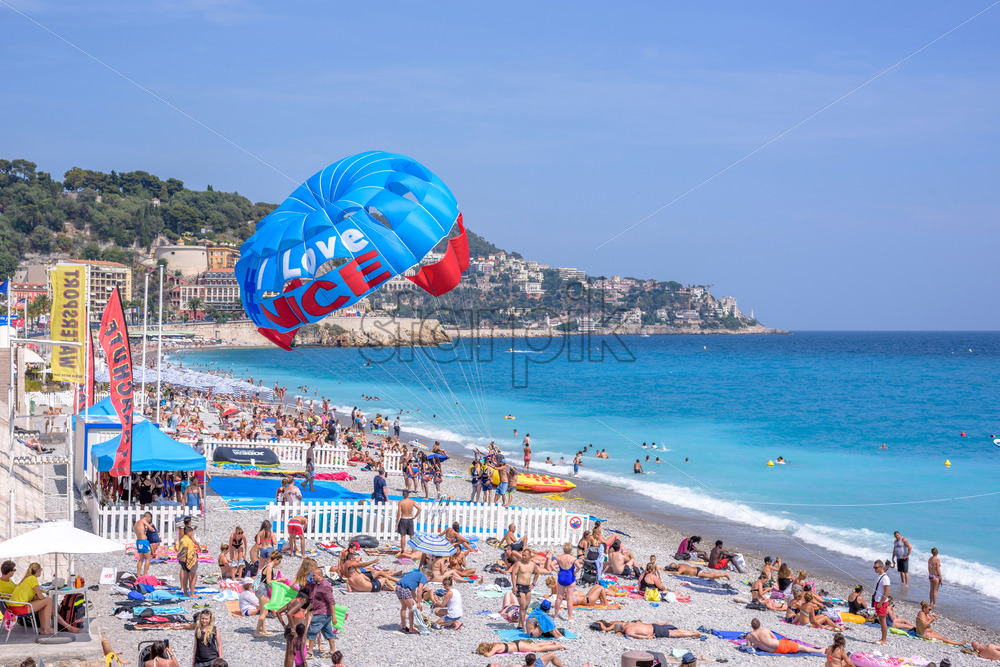 NICE COTE D’AZUR, FRANCE – JUNE 27, 2017: Beautiful daylight view to beach of Nice Cote d’Azur. People relaxing on beach and swimming in water. Parachute man landed on sand.