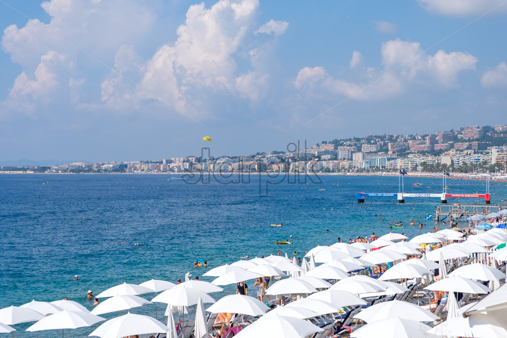Home » Shop » photo » NICE, FRANCE – AUGUST 08, 2018: Beach at daylight. Man parasailing. Clouds on background. View from top