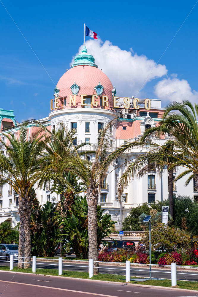 NICE, FRANCE – AUGUST 08, 2018: Negresco Hotel at daylight. View from shore Royalty Free Stock photo