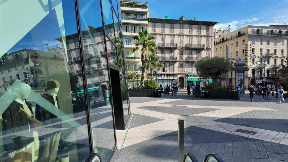 Nice, France – August 15 2025: Aerial view of people walking through the courtyard of the the Nicetoile shopping center, with the tram running through the square Royalty Free Stock Video Footage