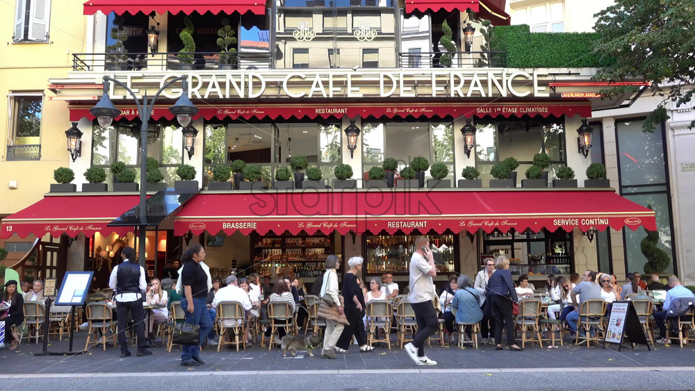 Nice, France – July 3, 2025: Busy outdoor seating at Le Grand Cafe de France with patrons dining under red awnings and pedestrians walking by on a sunny day Royalty Free Stock Video Footage