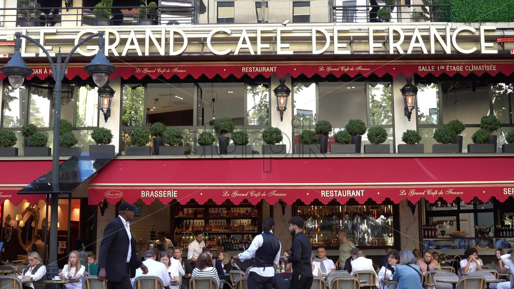 Nice, France – July 3, 2025: Busy outdoor seating at Le Grand Cafe de France with patrons dining under red awnings and pedestrians walking by on a sunny day Royalty Free Stock Video Footage
