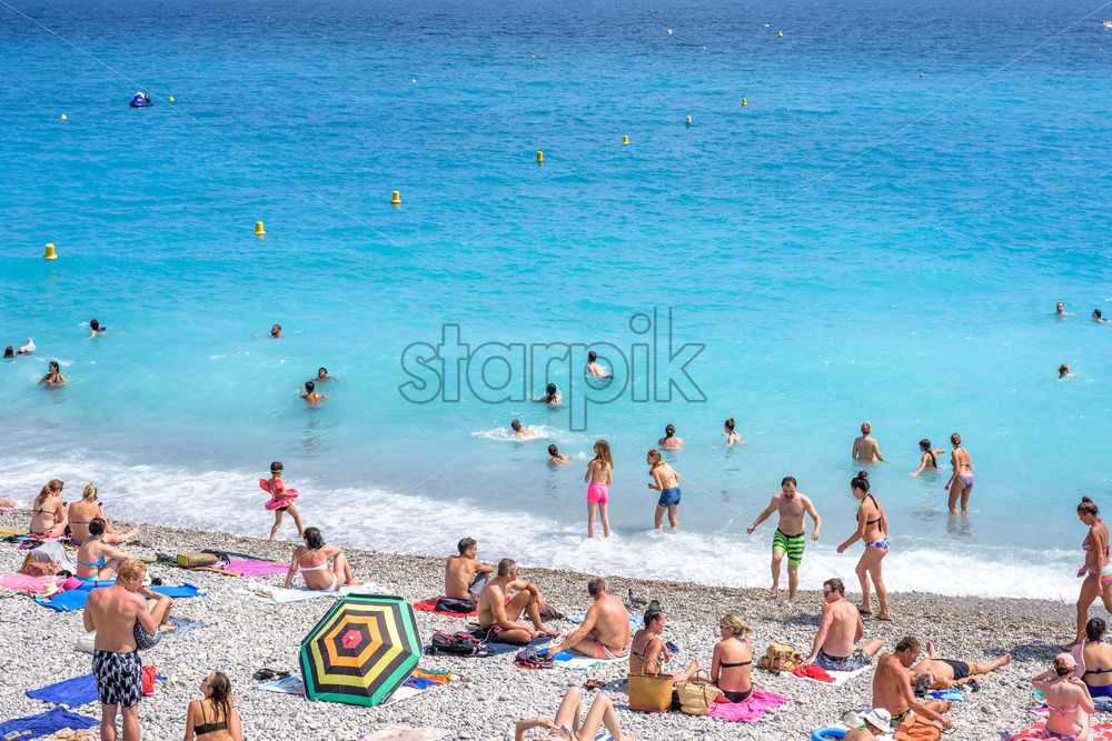 NICE, FRANCE – JUNE 27, 2017: Beautiful daylight view. Blue water with people walking on sand.