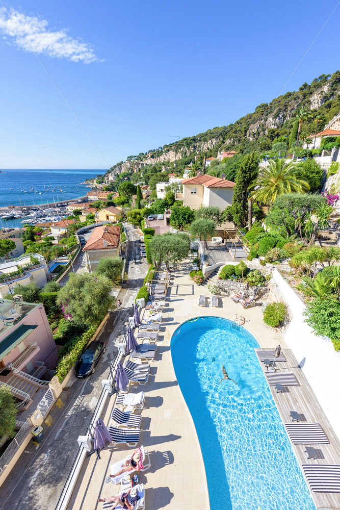 NICE, FRANCE – JUNE 28, 2017: Daylight view to hotel pool with people sitting on armchairs. Woman swimming in water. Yachts cruising on water