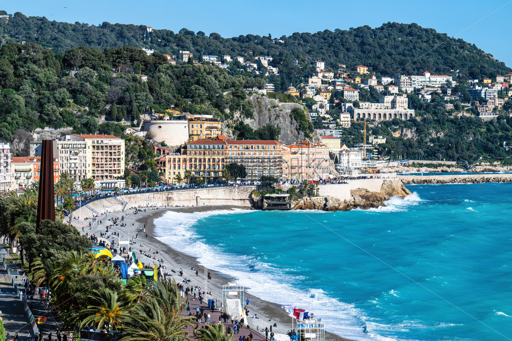 Nice, France – July 3, 2025: View of the I Love Nice sign on the Promenade des Anglais, with tourists enjoying the lookout and a passenger boat cruising across the Mediterranean Sea Royalty Free Stock Video Footage