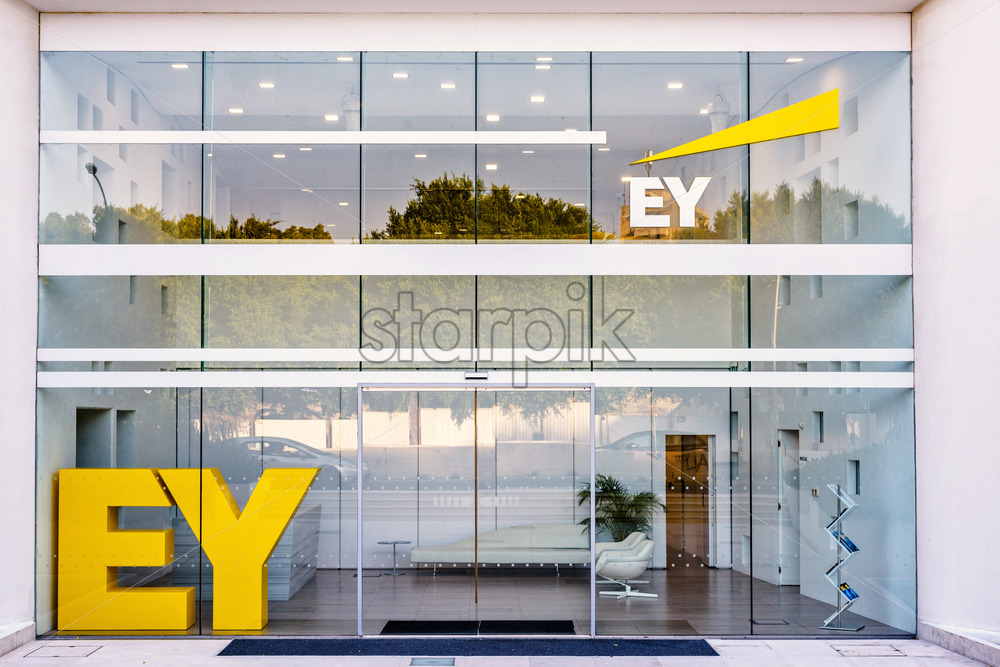 NICOSIA, CYPRUS – SEPTEMBER 14, 2017: Daylight view to EY company Office. Road and lights reflecting in windows