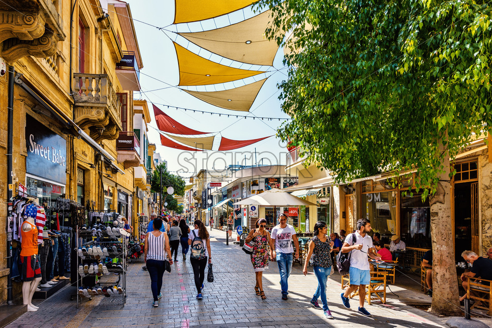 NICOSIA, CYPRUS – SEPTEMBER 14, 2017: Daylight view to Ledra street with people walking and exploring shops and restaurants. Sun shades between buildings. Royalty Free Stock photo