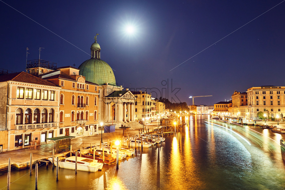 Night cityscape of Venice city colorful buildings on water. Place for text. Italy beauties