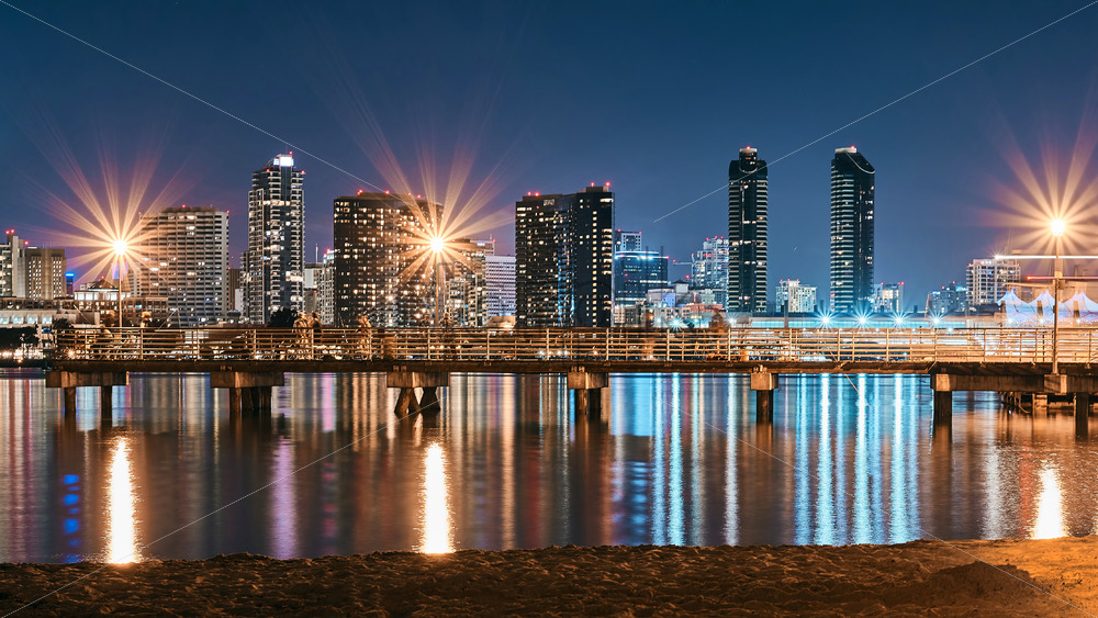 Night downtown cityscape with pier on foreground. Colorful lights. San Diego, California