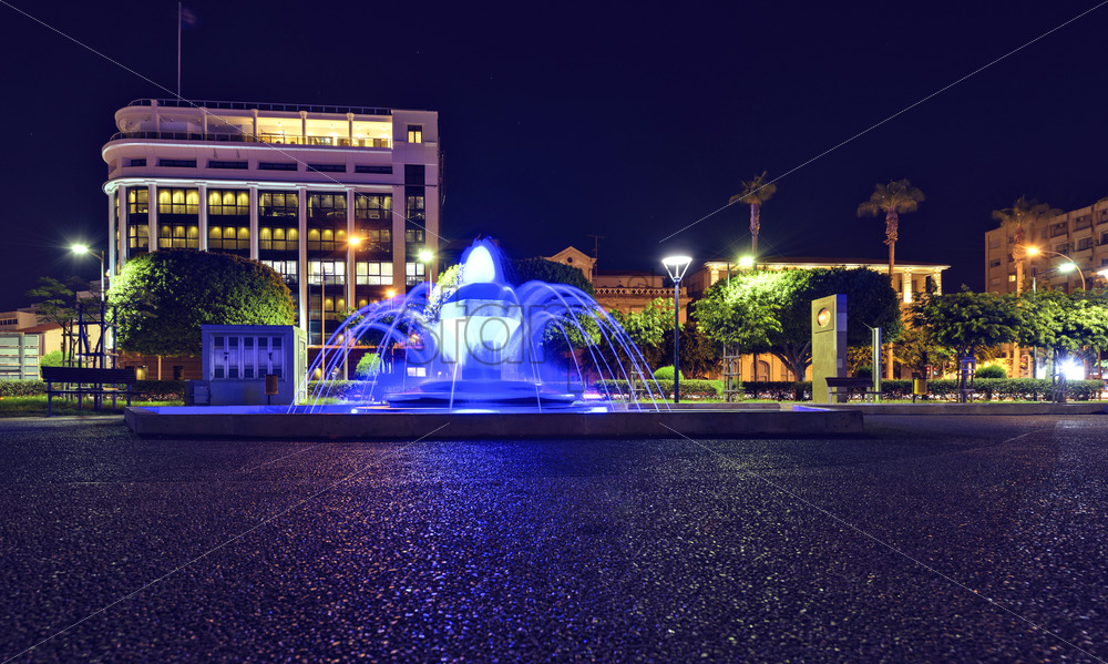 Home » Shop » city » Night view to modern public fountain with blue light glowing. Hotel and park on background. Negative copy space, place for text. Molos Promenade, Limassol, Cyprus