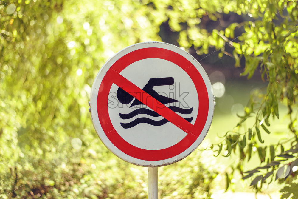 No swimming sign in park of the city. Sunny day on background. Close-up shot. Bucharest, Romania
