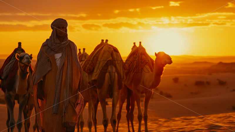 A nomad, adorned in traditional clothing, stands amidst a caravan of camels in the lush oasis of the Sahara Desert.