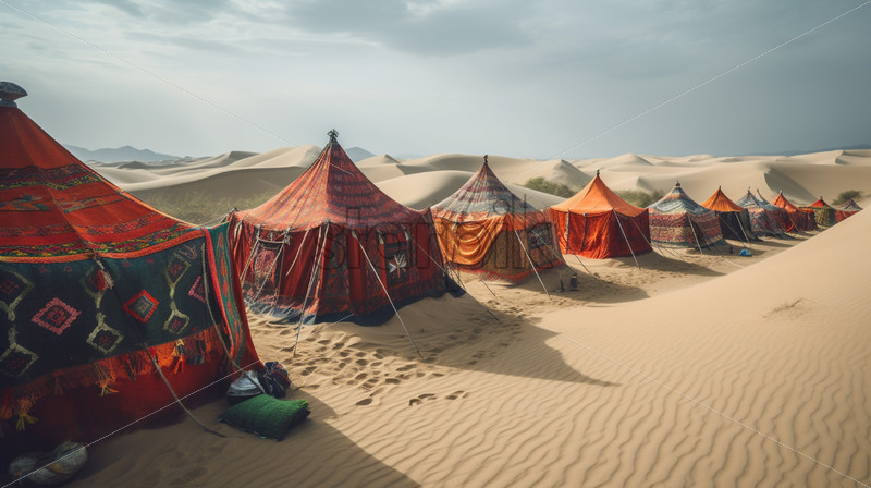 Nomadic tribes setting up colorful tents in the midst of endless sand dunes