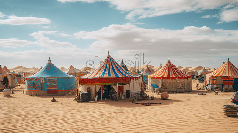 Nomadic tribes setting up colorful tents in the midst of endless sand dunes
