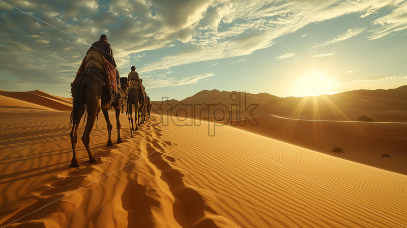 Bedouin nomads in a caravan of camels through the vast and dynamic Sahara desert landscape.