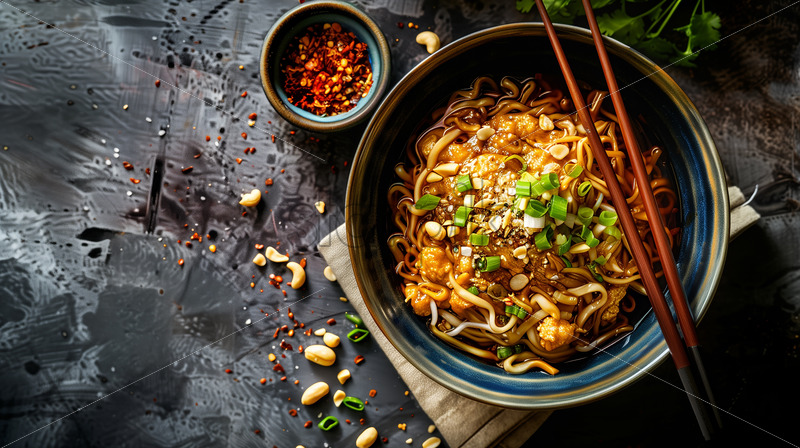 Dan Dan noodles placed on a textured surface, garnished with crushed peanuts and sliced green onions.