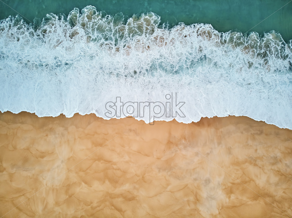 Aerial drone view of people relaxing on the beach with hitting the shore in Alicante, Spain. Vertical Royalty Free Stock Video Footage
