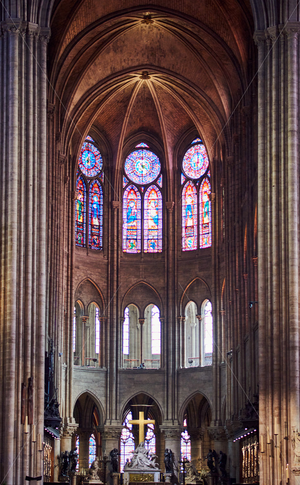 Notre Dame Cathedral interior with stained glass. Paris, France