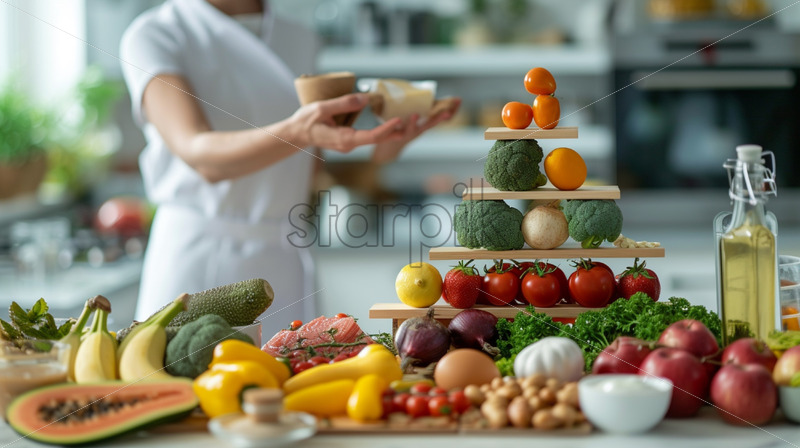 Nutritionist pointing to food pyramid on chart