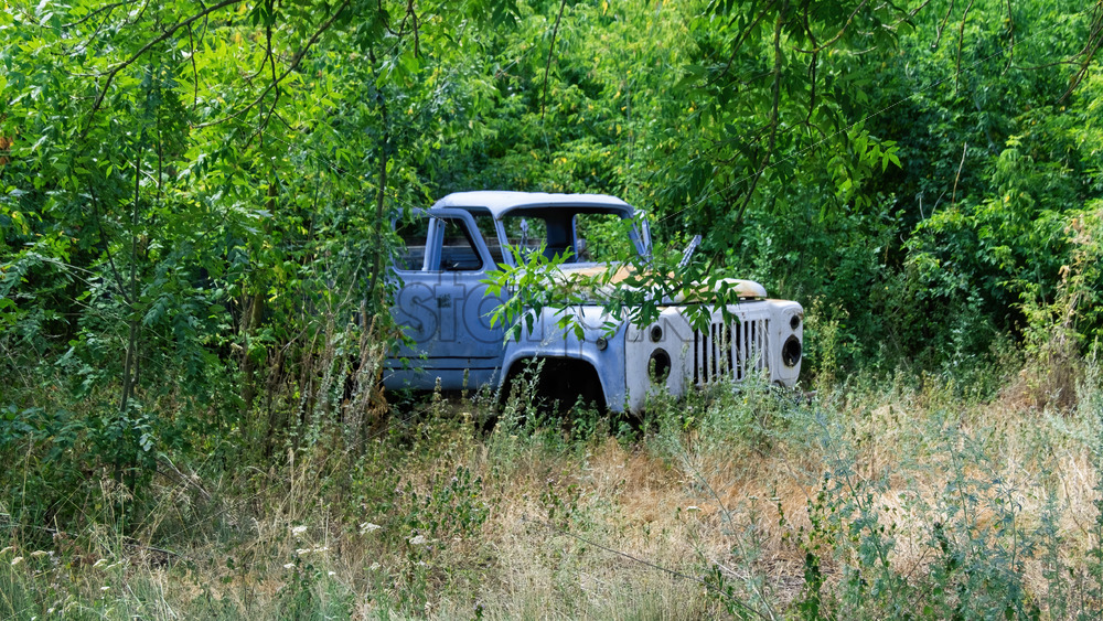 Home » Shop » photo » Old abandoned truck with opened doors with multiple greenery around in Moldova