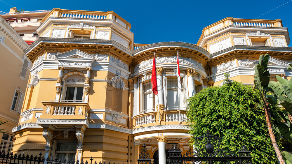 Exterior of an old building made in traditional style with national flag of Monaco