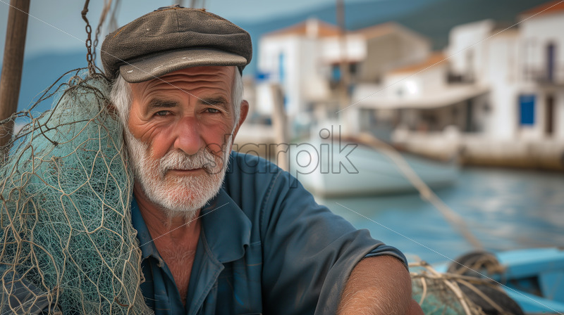 Close-up photo of a Greek fisherman with his nets, surrounded by white-washed buildings.