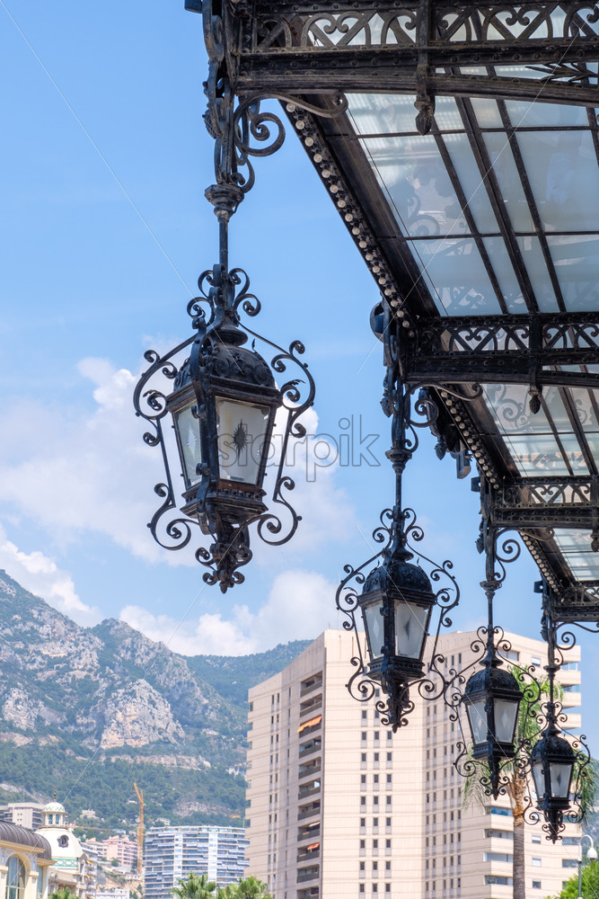 Old hanging lamps in Monte Carlo. City on background. Monaco beauties Royalty Free Stock photo