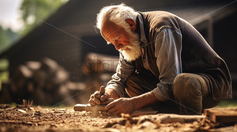 A carpenter, wearing his carpenter outfit, focuses with a serious expression while skillfully crafting a wooden table using a chisel and hammer, capturing the essence of meticulous craftsmanship
