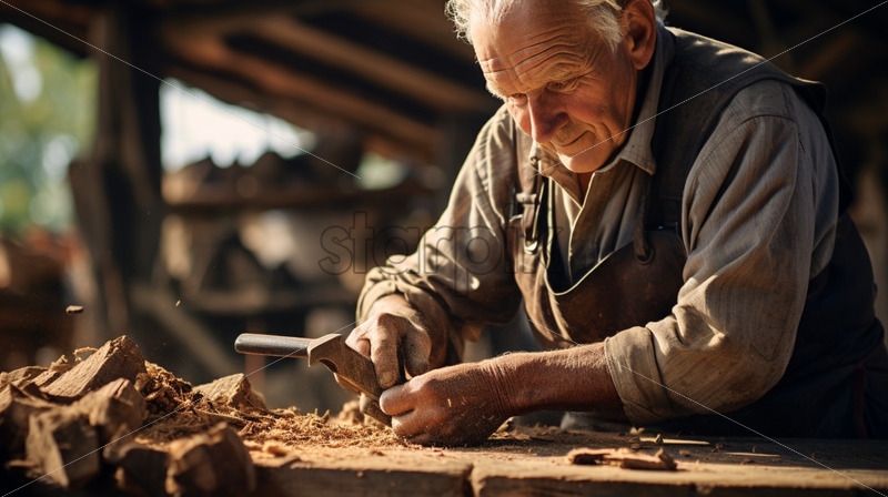 A 50-year-old male carpenter, donned in his carpenter outfit, measures and cuts plywood with expertise in the morning sunlight, creating a timeless scene of dedication and craftsmanship in his wood working space