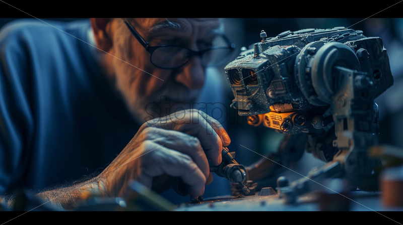 Two young engineers fixing a mechanical robot in the workshop, using VR virtual reality headsets