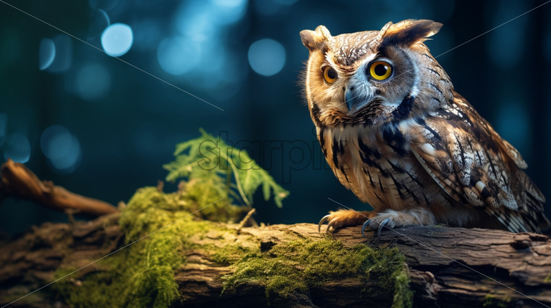 Home » Shop » Uncategorised » Old, wise-looking owl perched on a gnarled branch, surveying the nocturnal jungle landscape