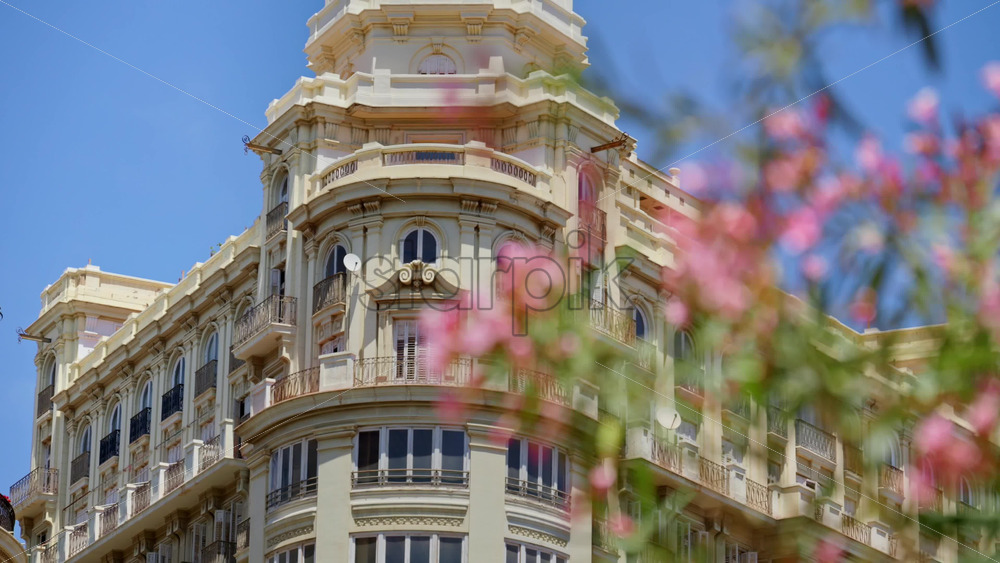 Oleander blossoms swaying with cream coloured, richly decorated apartment blocks on the background in Valencia, Spain Royalty Free Stock Video Footage