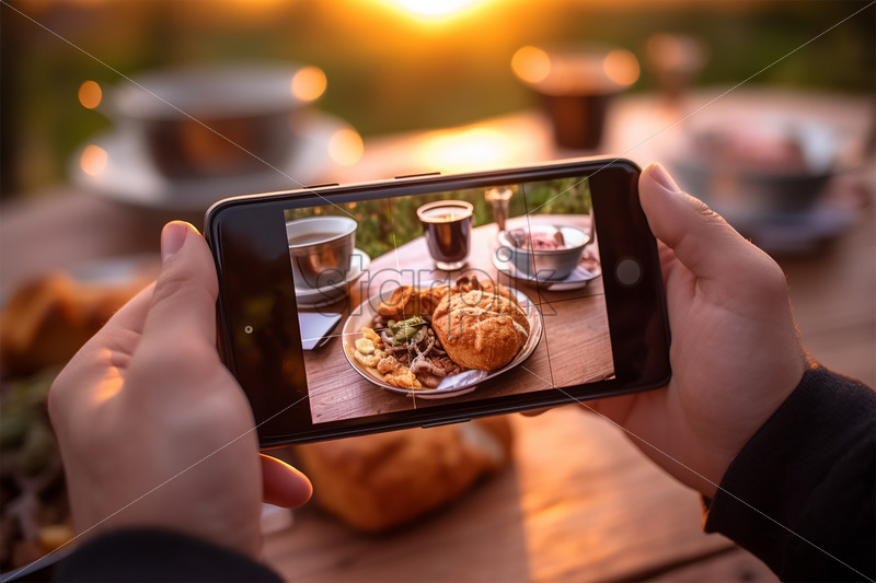 Home » Shop » AI Illustration » One hand holds a phone photographing a table full of dishes
