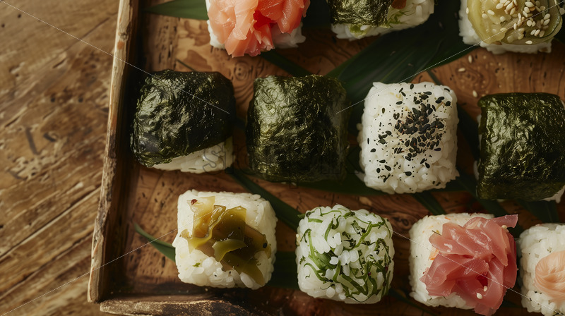 Onigiri rice balls with each onigiri wrapped in a sheet of nori seaweed and filled with different savory fillings.