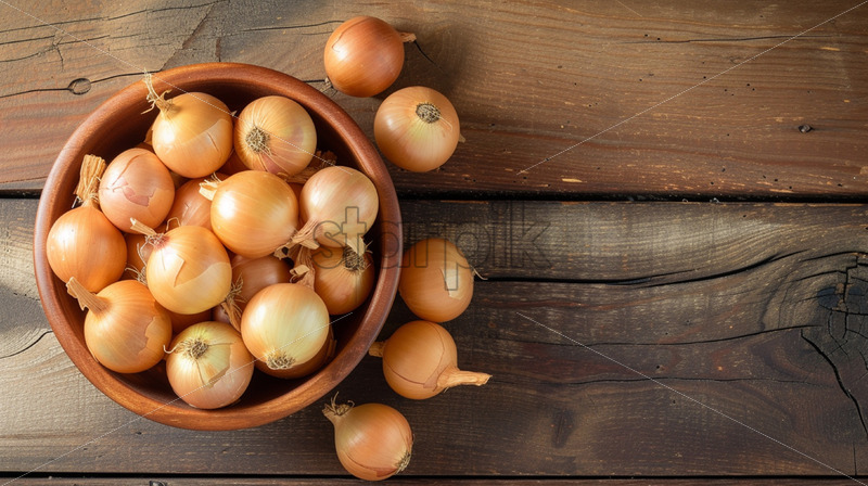 Onions in a wooden bowl on a table