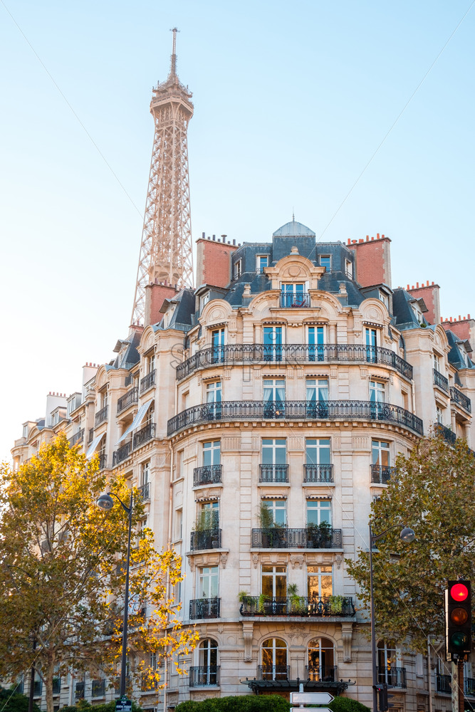 Orange and teal style house in Paris. Eiffel tower in the background. Warm photo. Close up shot. French beauties Royalty Free Stock photo